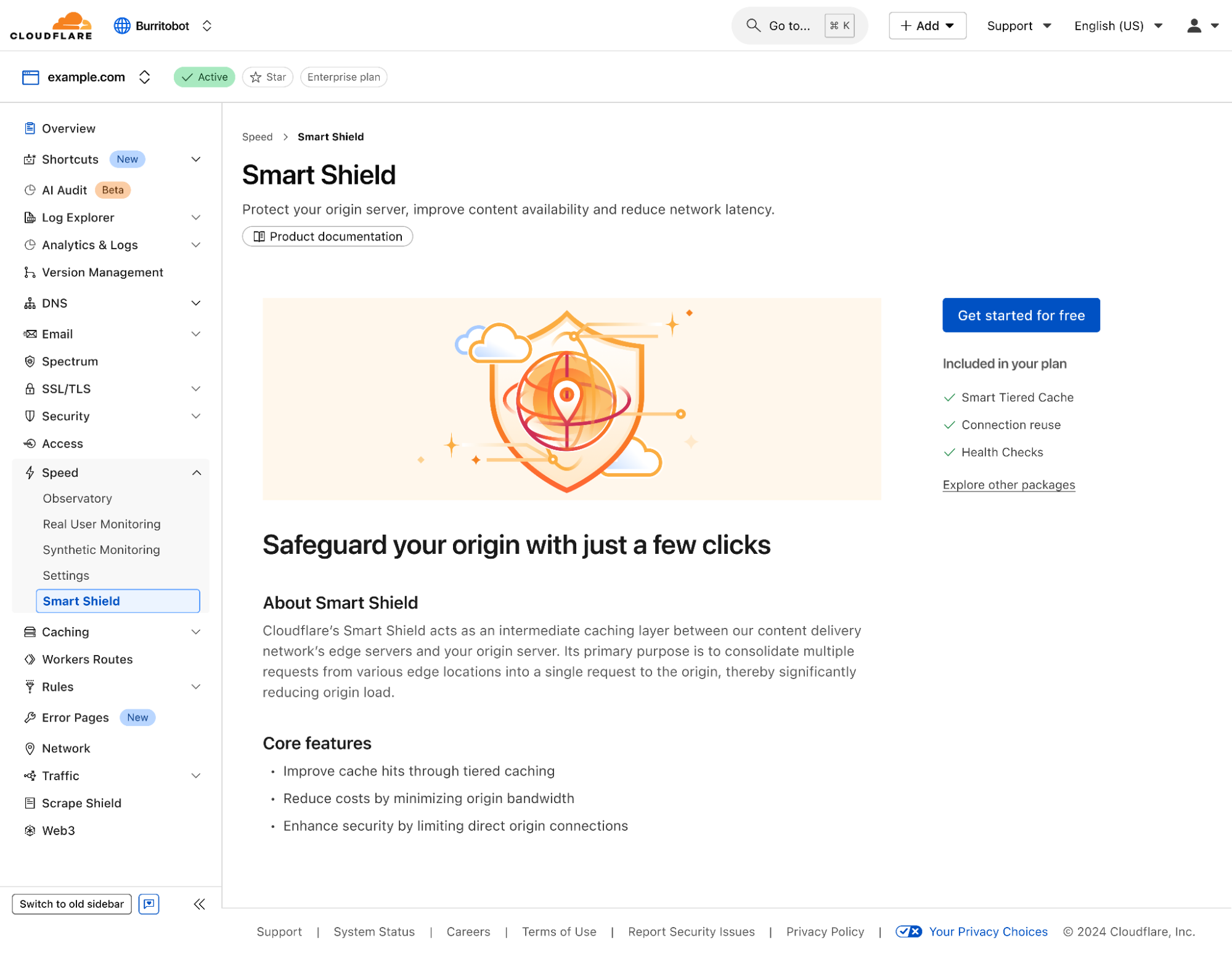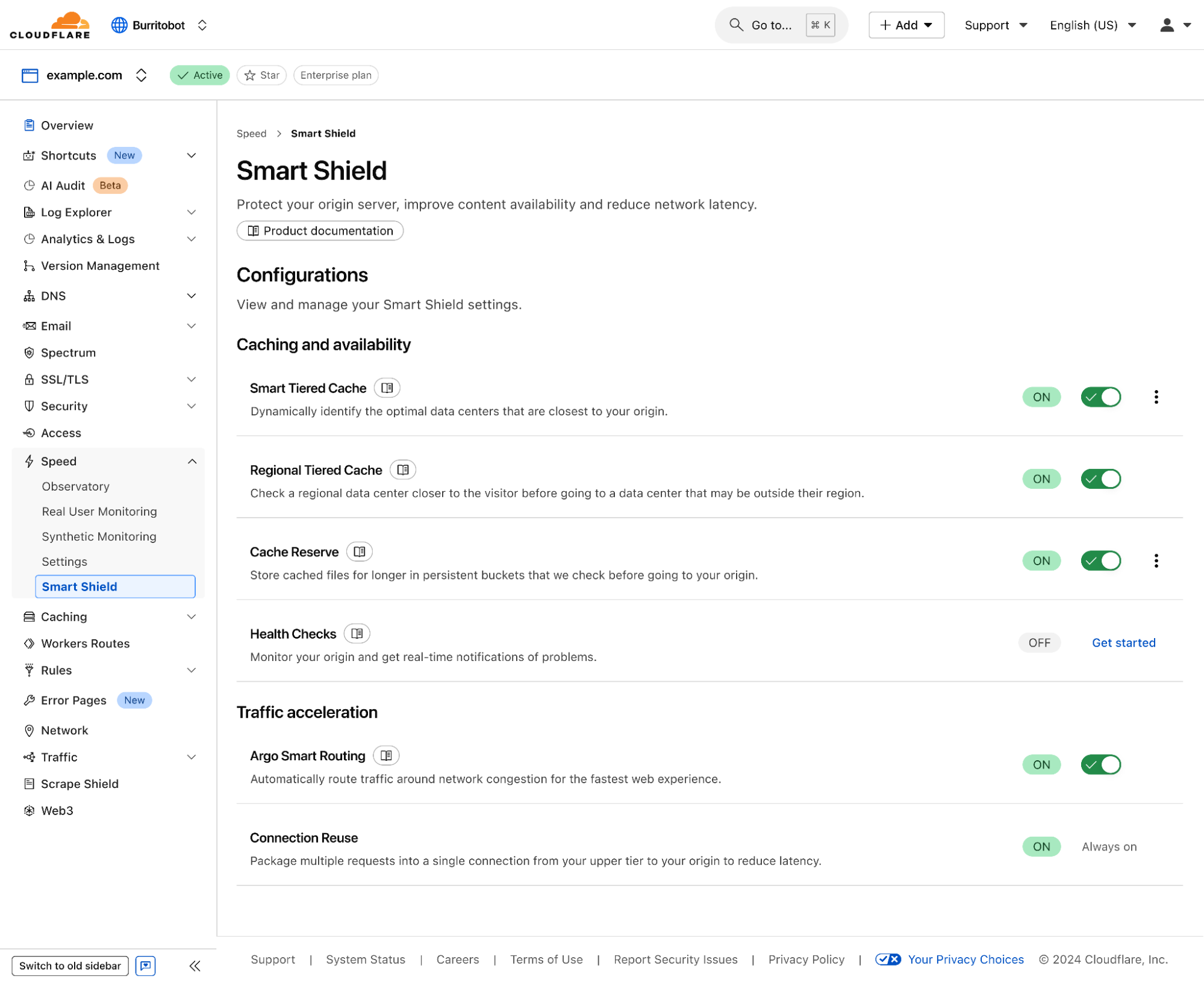 Smart Shield transforms origin protection from a complex, multi-tool challenge into a streamlined, intelligent solution that works on your behalf. Our unified API and UI combines all origin protection essentials — dynamic traffic acceleration, intelligent caching, health monitoring, and dedicated egress IPs — into one place that enables single-click configuration.