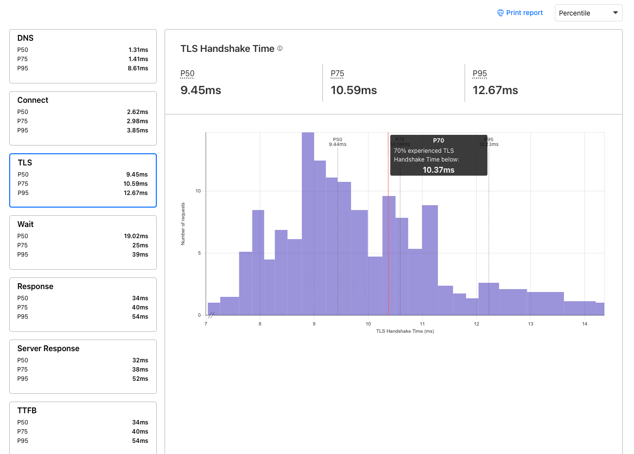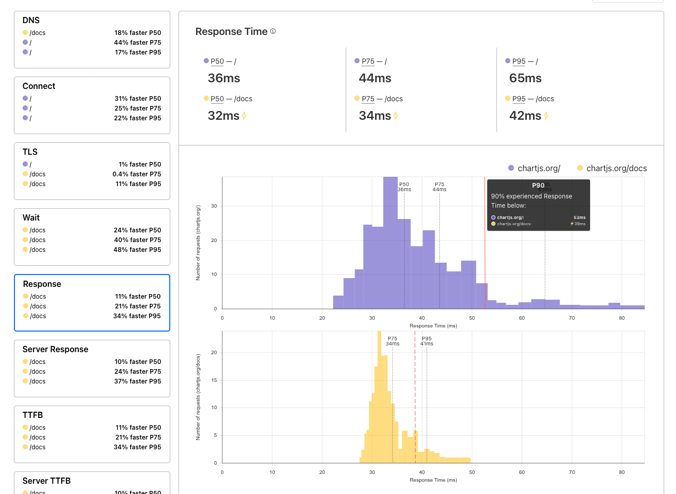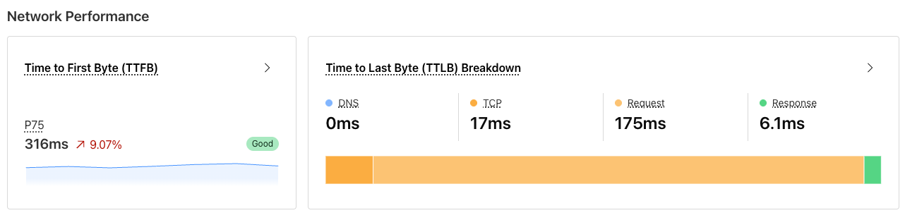 TTFB is an ill-defined blackbox, so we’re making a point to break that down into its various subparts so you can quickly pinpoint if the issue is with the connection establishment, the server response time, the network itself, and more. We’ll be working to break this down even further in the coming months as we expose the complete lifecycle of a request so you’re able to pinpoint exactly where the bottlenecks lie.