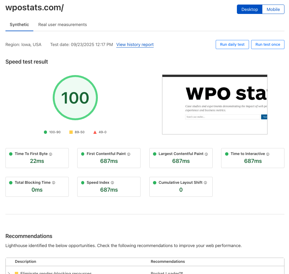 The first synthetic test is a browser test. A browser test will load the requested page in a headless browser, run Google’s Lighthouse on it to report on key performance metrics, and provide some light suggestions for improvement.