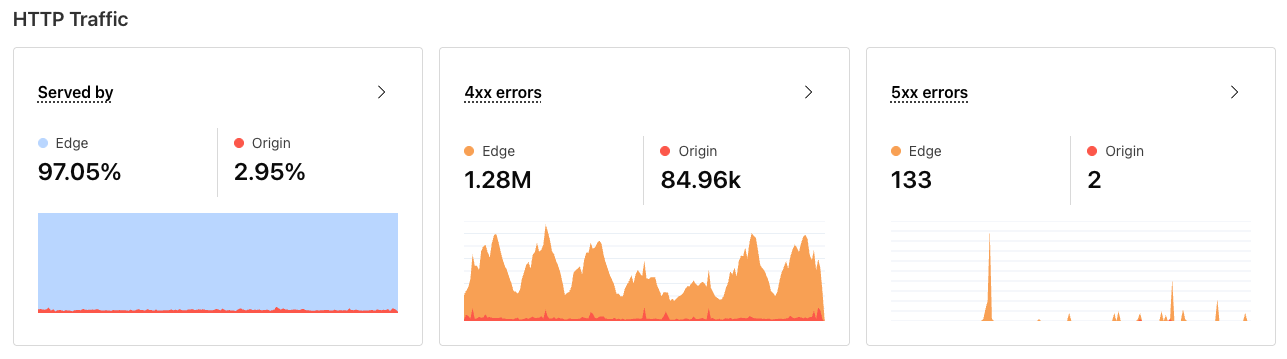 Observatory prominently surfaces cache hit ratio and error rates for both the edge and origin. This compliments the backend telemetry nicely, and helps to further breakdown the backend metrics you are seeing to help pinpoint areas of improvement.