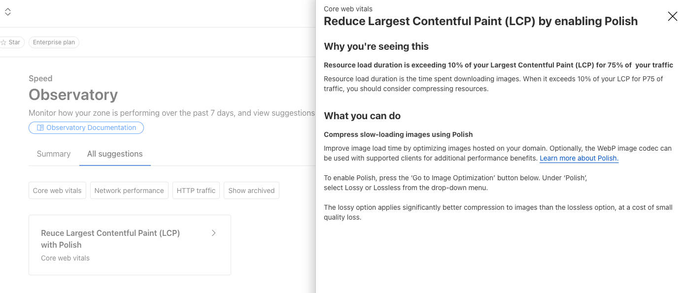 In the example above, our recommendation engine analyzes the site's real-user data and notices that Resource Load Delay accounts for over 10% of total LCP time. As a result, there’s a high likelihood that the resource triggering LCP is large and could potentially be compressed to reduce file size. So we make a recommendation to enable compression using Polish.