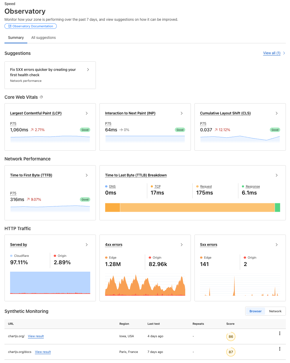 Every day, Cloudflare handles traffic for over 20% of the web, giving us a unique vantage point into what makes websites faster and more resilient. We built Observatory to take advantage of this position, uniting data that is normally scattered across different tools — including real-user data, synthetic testing, error rates, and backend telemetry — into a single platform. This gives you a complete, cohesive picture of your application's health end-to-end, in one spot, and enables you to easily identify and resolve performance issues.