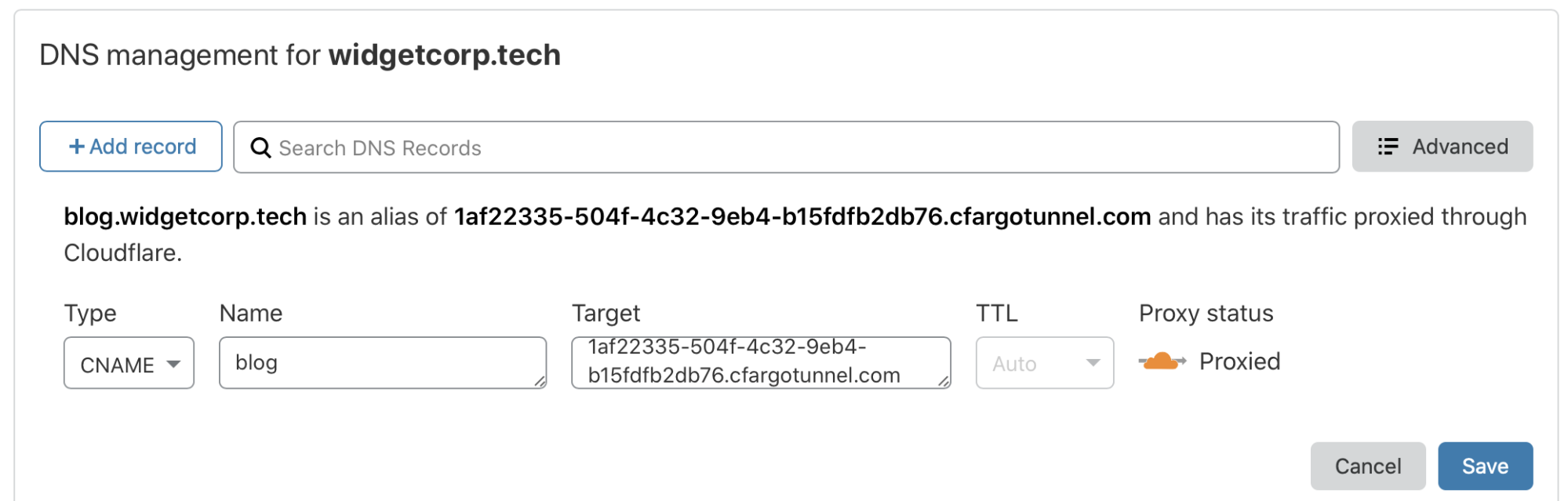 to associate the DNS record with the Tunnel address. You will only be able to create a DNS record from cloudflared