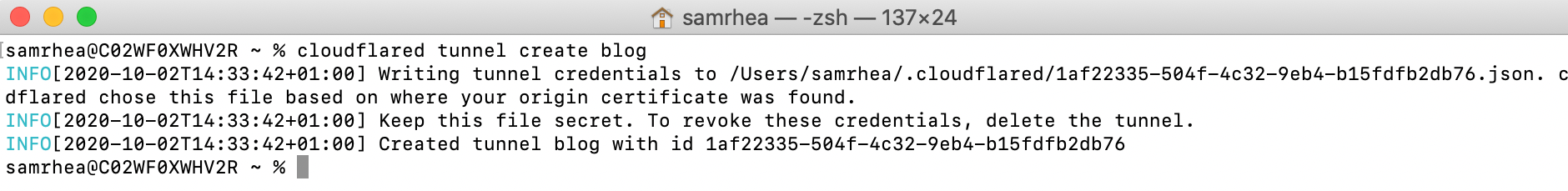 Similarly, if you want to let another person on your team run the Tunnel, you can send them the credentials file without sharing the cert.pem file as well. The cert.pem file is still required to create additional Tunnels, list existing tunnels, manage DNS records, or delete Tunnels.