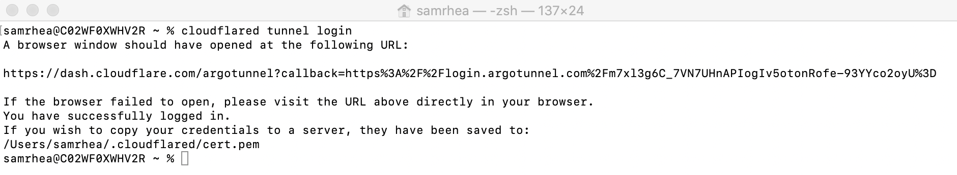 and authenticate to your Cloudflare account. This step will generate a cert.pem file. That certificate contains a token that gives your instance of cloudflared the ability to create Named Tunnels in your account, as well as the ability to eventually point DNS records to them.