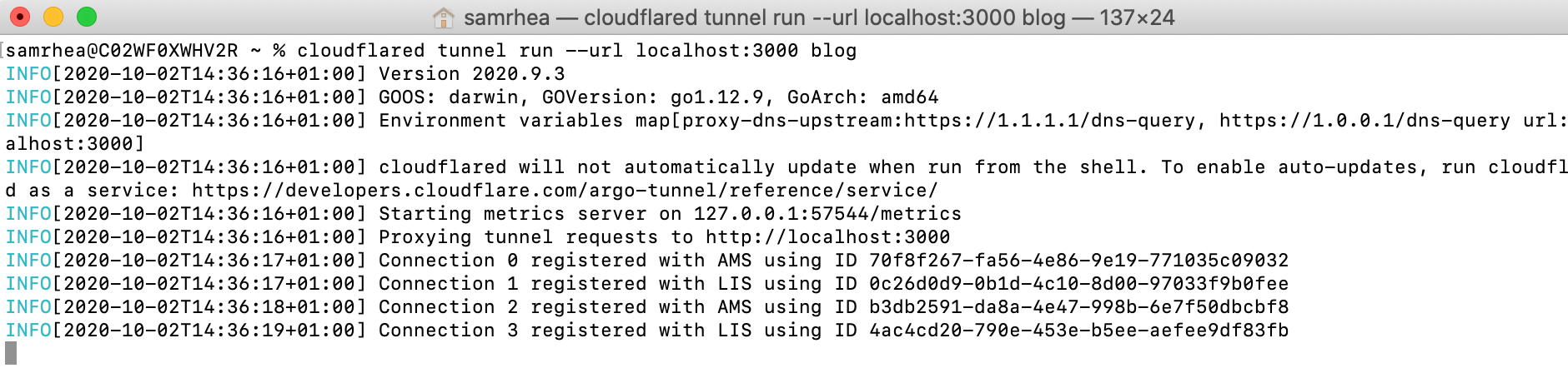 and it will start proxying traffic. If you are running the Tunnel without the cert.pem file and only the credentials file, you must use cloudflared tunnel run <UUID>