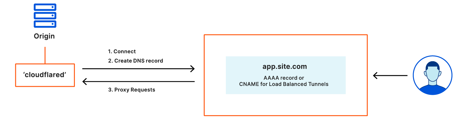 creates a public DNS record for your hostname which points to a randomly generated CNAME record for load balanced Tunnels or an IPv6 for traditional Tunnels. The ephemeral CNAME record represents your Tunnel.The control plane then tells Cloudflare’s edge about these DNS entries and where the CNAME or IP address should send traffic. Traffic can now be routed to cloudflared.
