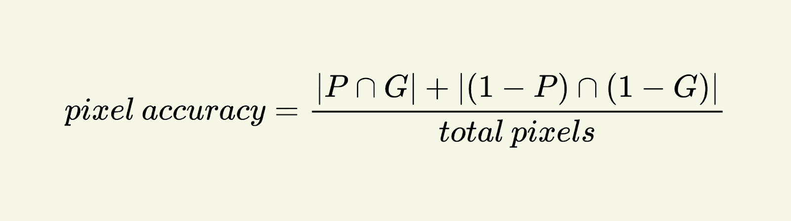 Pixel accuracy measures the percentage of pixels that were correctly labeled as either the foreground or the background. Mathematically, pixel accuracy is written as: