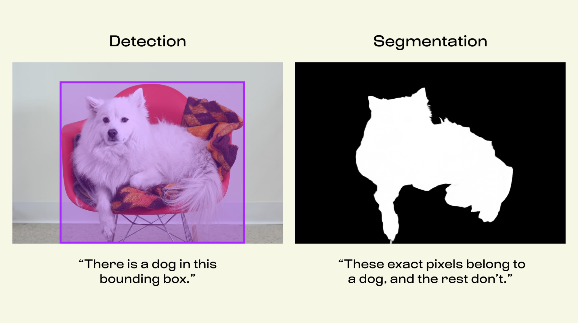 In this photograph of my dog, a detection model predicts that a bounding box contains a dog; a segmentation model predicts that some pixels belong to a dog, while all other pixels don’t.