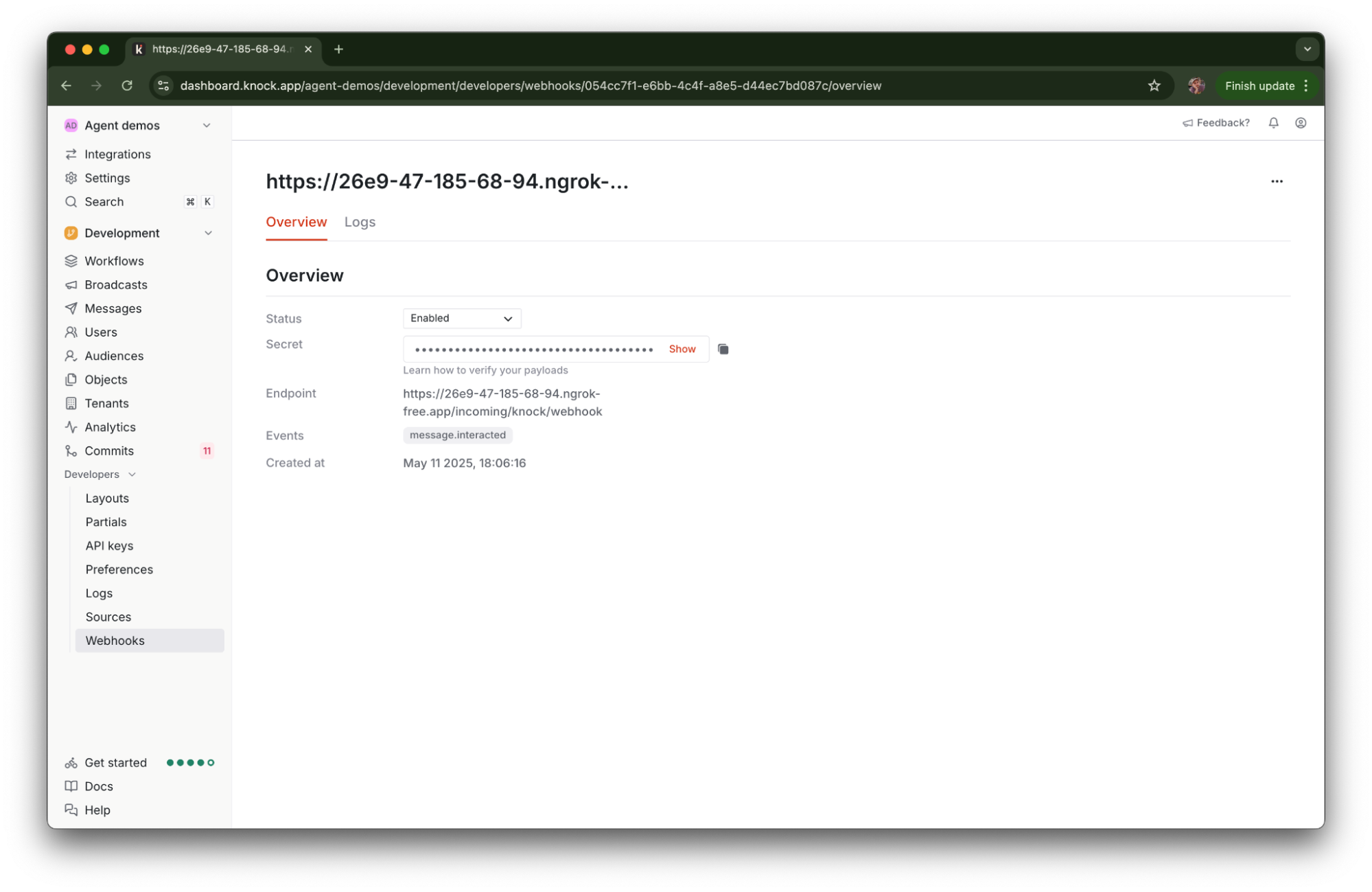 webhook handler within the Knock dashboard to forward the interactions to our worker, and ultimately to our agent process.