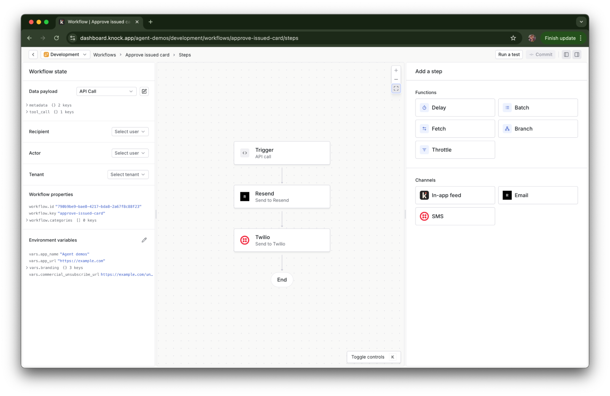 Within Knock, we design our approval workflow using the visual workflow builder to create the cross-channel messaging logic. We then make the notification templates associated with each channel to which we want to send messages.