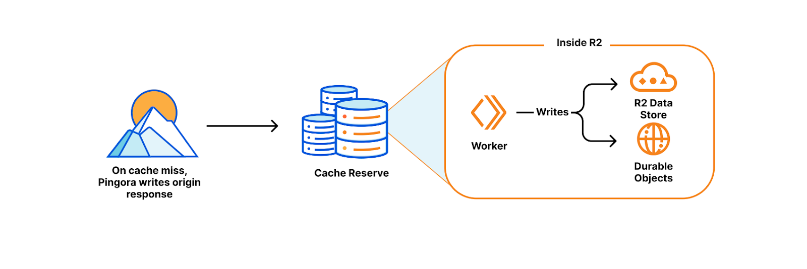 Inside R2, a Worker writes the content to R2’s persistent data storage while also keeping track of the important metadata that Pingora sends about the object (like origin headers, freshness values, and retention information) using Durable Objects storage.