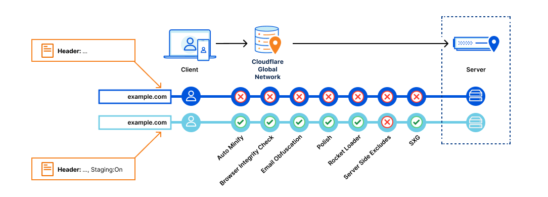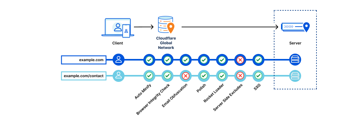 These actions effectively ‘override’ the corresponding zone-wide setting for matching traffic. For example, Rocket Loader may be enabled for the zone example.com