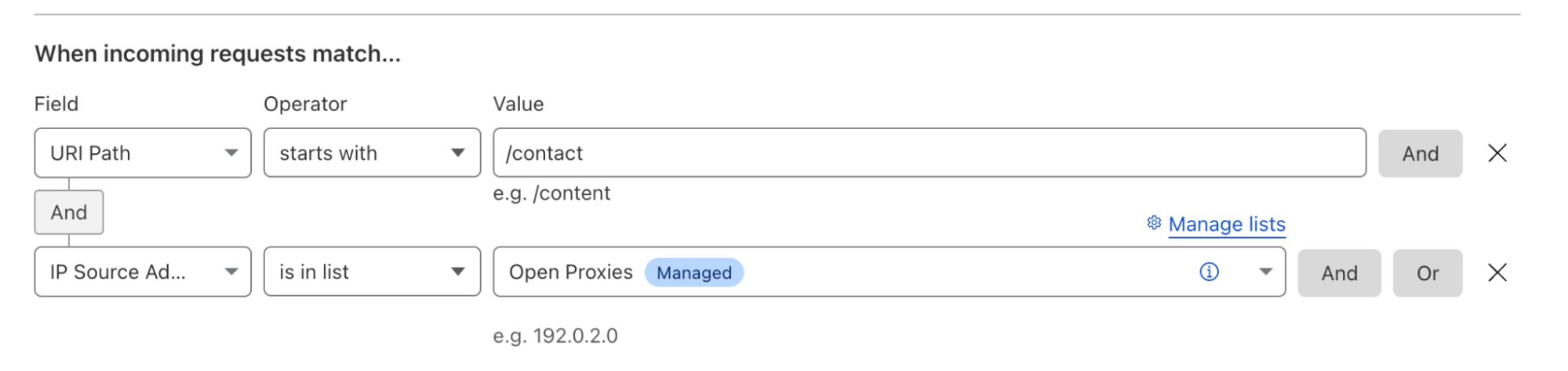 Configuration Rules can take this use case and augment it with additional fields, such as whether the source IP address is in a Cloudflare Managed IP List. This allows users to be more specific about when the security level is changed to ‘High’, such as only when the request also is marged as coming from an open HTTP and SOCKS proxy endpoints, which are frequently used to launch attacks and hide attackers identity: