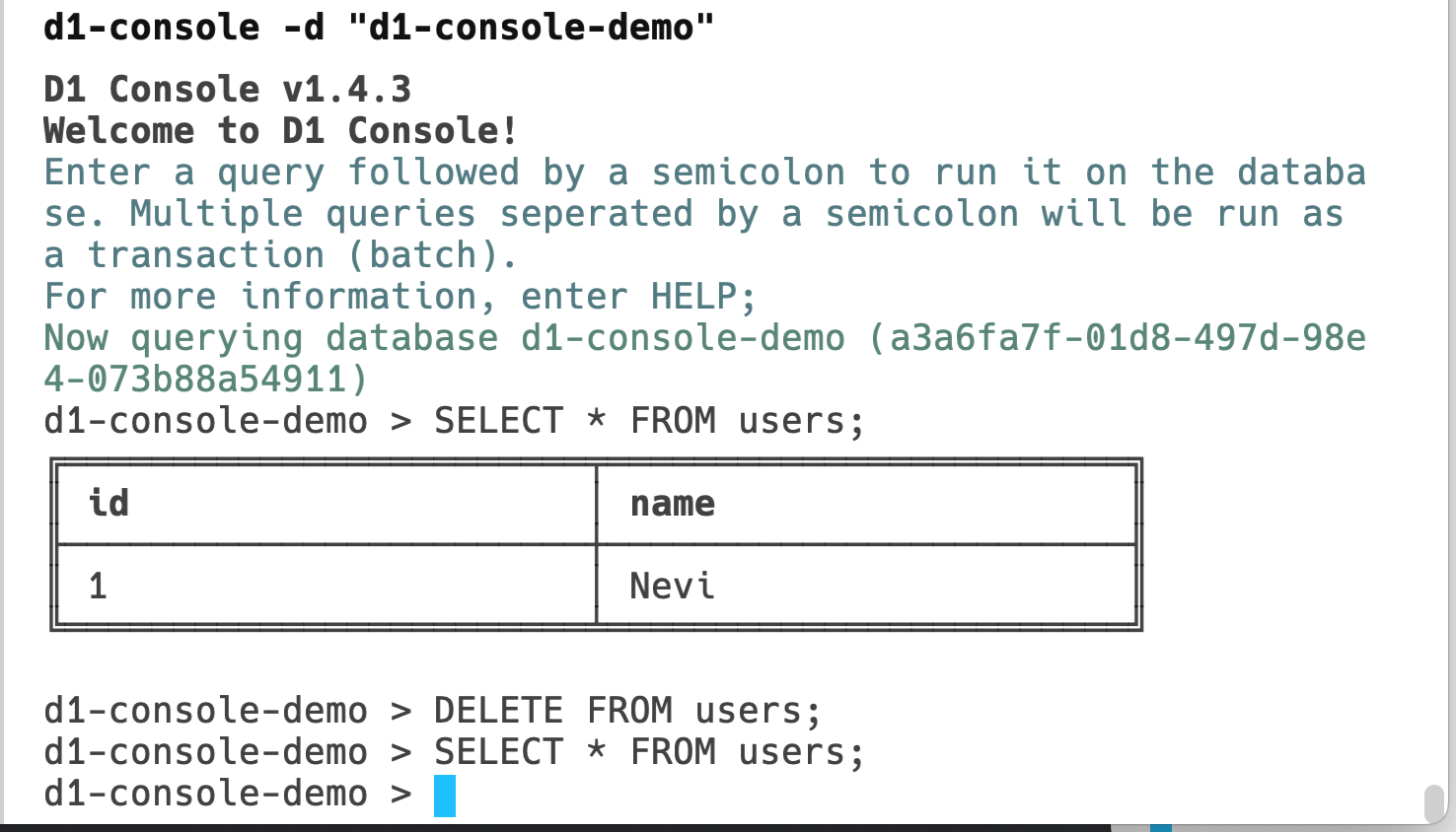 command in your terminal every time you want to interact with your database, you can interact with D1 from within the d1-console