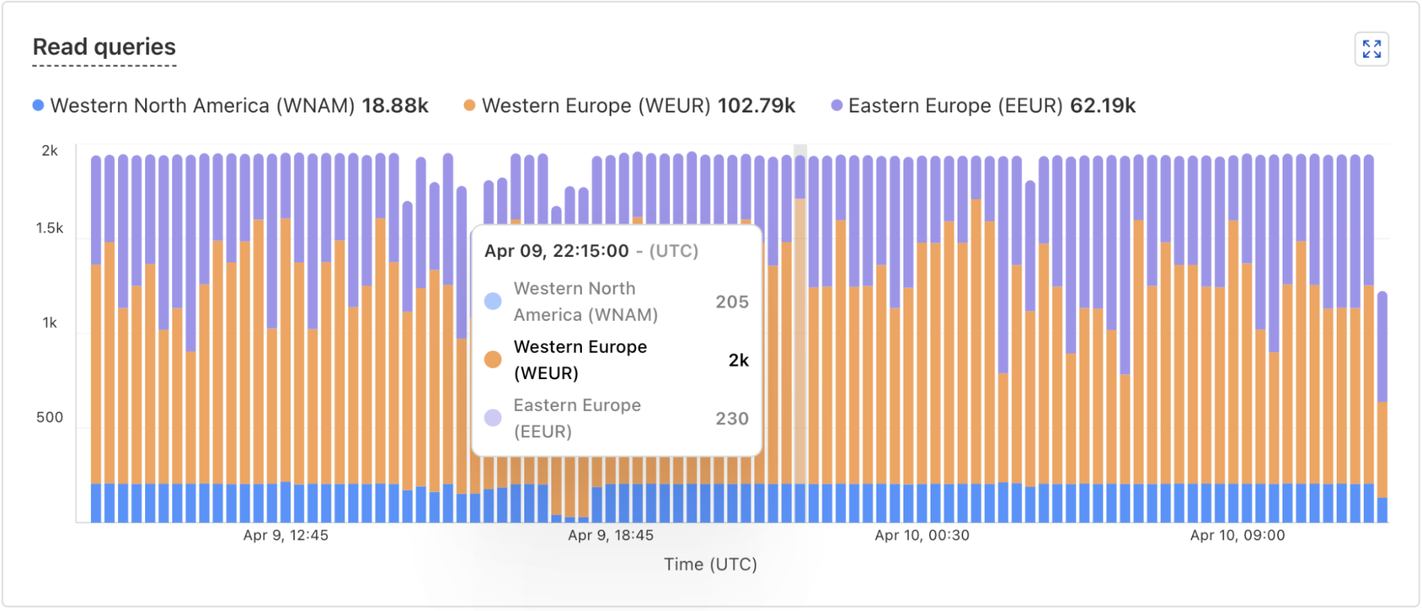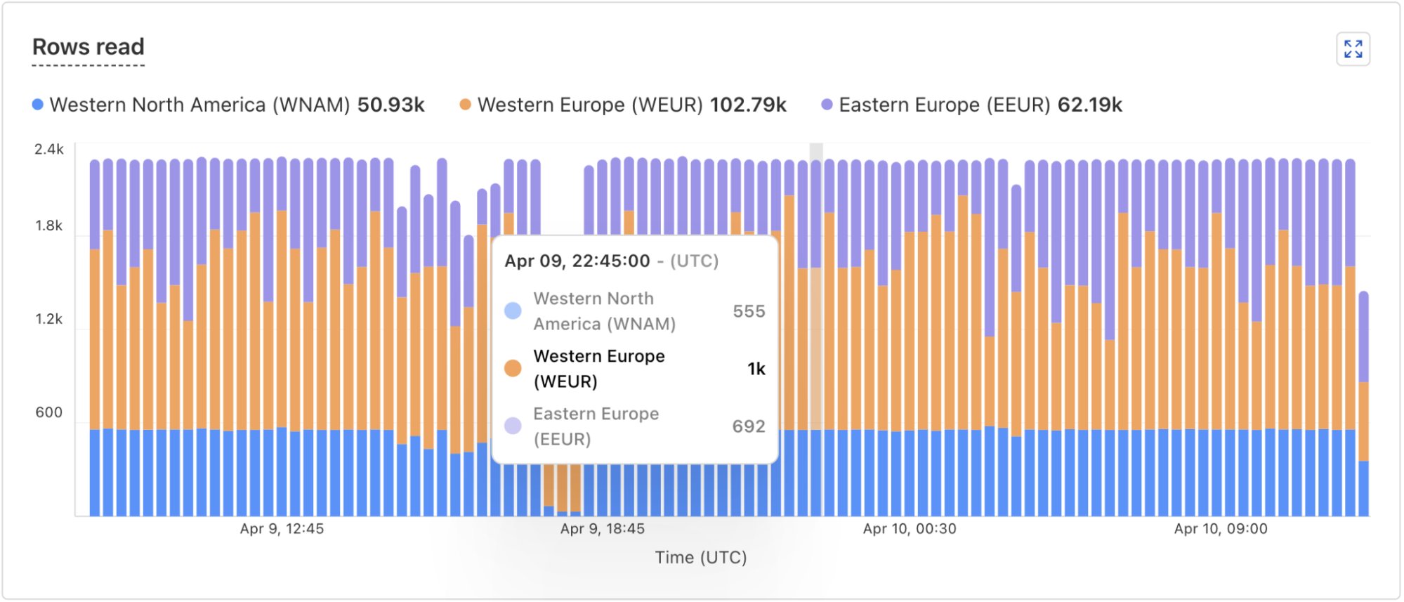 In addition, the D1 dashboard overview for a database now includes information about the database instances handling your queries. You can see how many queries are handled by the primary instance or by a replica, and a breakdown of the queries processed by region. The example screenshots below show graphs displaying the number of queries executed and number of rows read by each region.