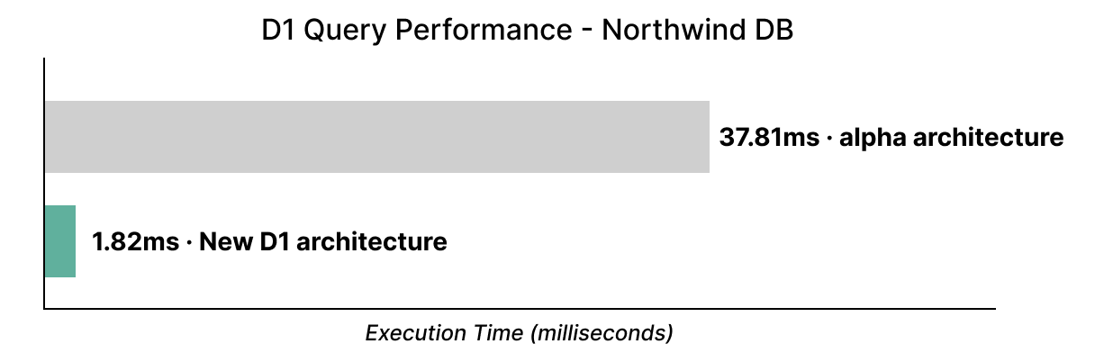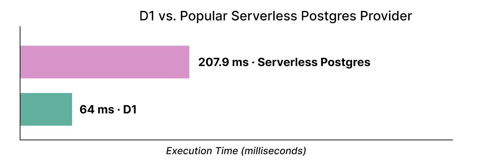 With our new storage backend, we also want to make clear that D1 is not a toy, and we’re constantly benchmarking our performance against other serverless databases. A query against a 500,000 row key-value table (recognizing that benchmarks are inherently synthetic) sees D1 perform about 3.2x faster than a popular serverless Postgres provider: