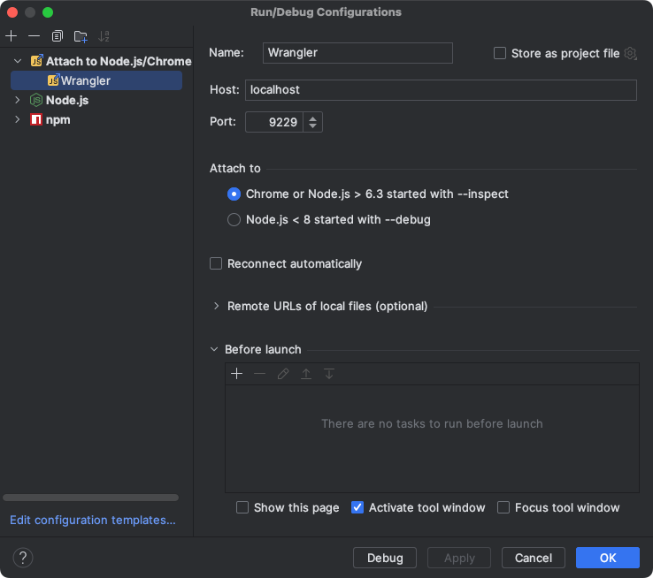 Setting up WebStormTo set up WebStorm with breakpoint debugging, create a new “Attach to Node.js/Chrome” Debug Configuration, setting the port to 9229