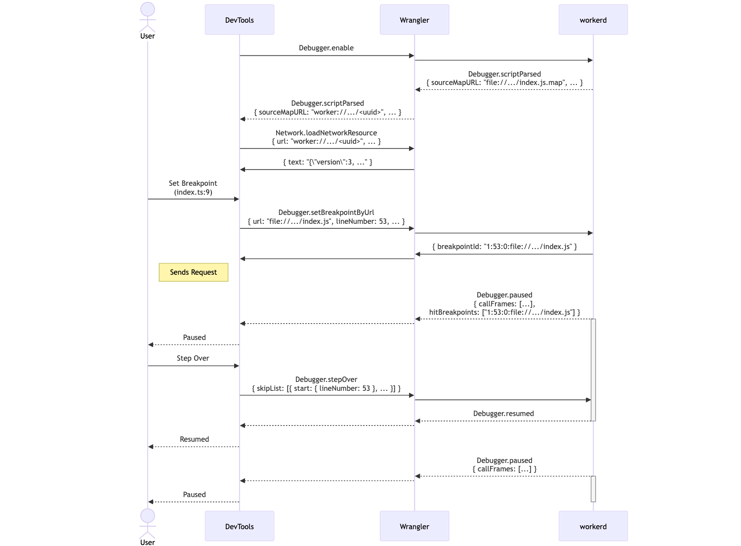 We solved this event processing problem by adding an I/O thread to workerd. The I/O thread handles sending and receiving CDP messages, because the thread executing JavaScript can be suspended due to hitting a breakpoint or a JavaScript `debugger` statement. The I/O thread wakes the JavaScript thread when CDP commands arrive and also handles sending responses back to the CDP client. Conceptually, this was not difficult, but it required some careful synchronization to avoid dropped messages.