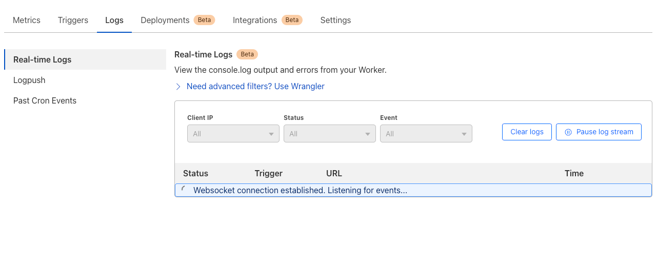 statements are visible via the Real-time Logs interface in the Cloudflare Dashboard or via the Workers CLI tool, Wrangler, using the wrangler tail