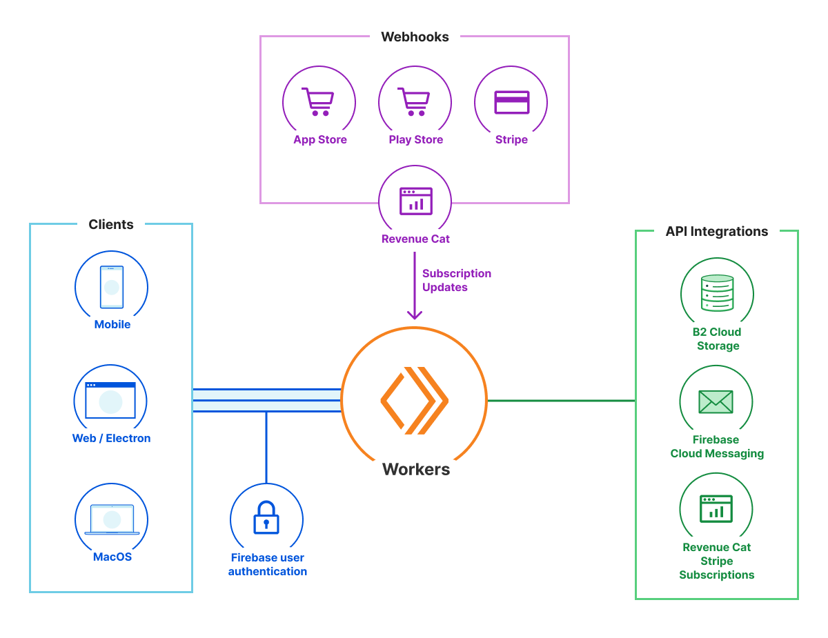 As Erwin mentioned, the architecture for cClip isn’t just Workers, but it integrates with a few other SaaS products as well. I use RevenueCat to easily integrate with the mobile app stores and Stripe via Webhooks. Firebase is used for both authentication and messaging, and, lastly, B2 for cloud storage. (At least until R2 is available!)