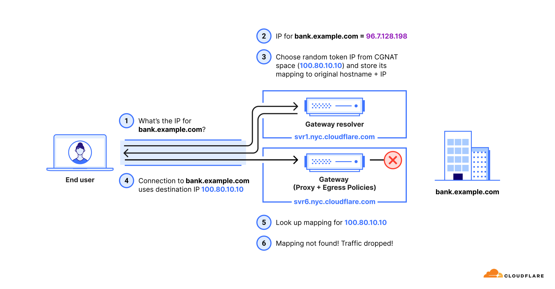 Returning to our running example, suppose that the end user’s DNS traffic lands on one Cloudflare server while the end user’s network traffic lands on a different Cloudflare server. Those servers do not share state. Thus, it’s not possible to associate the mapping from hostname to its actual destination IP address (bank.example.com
