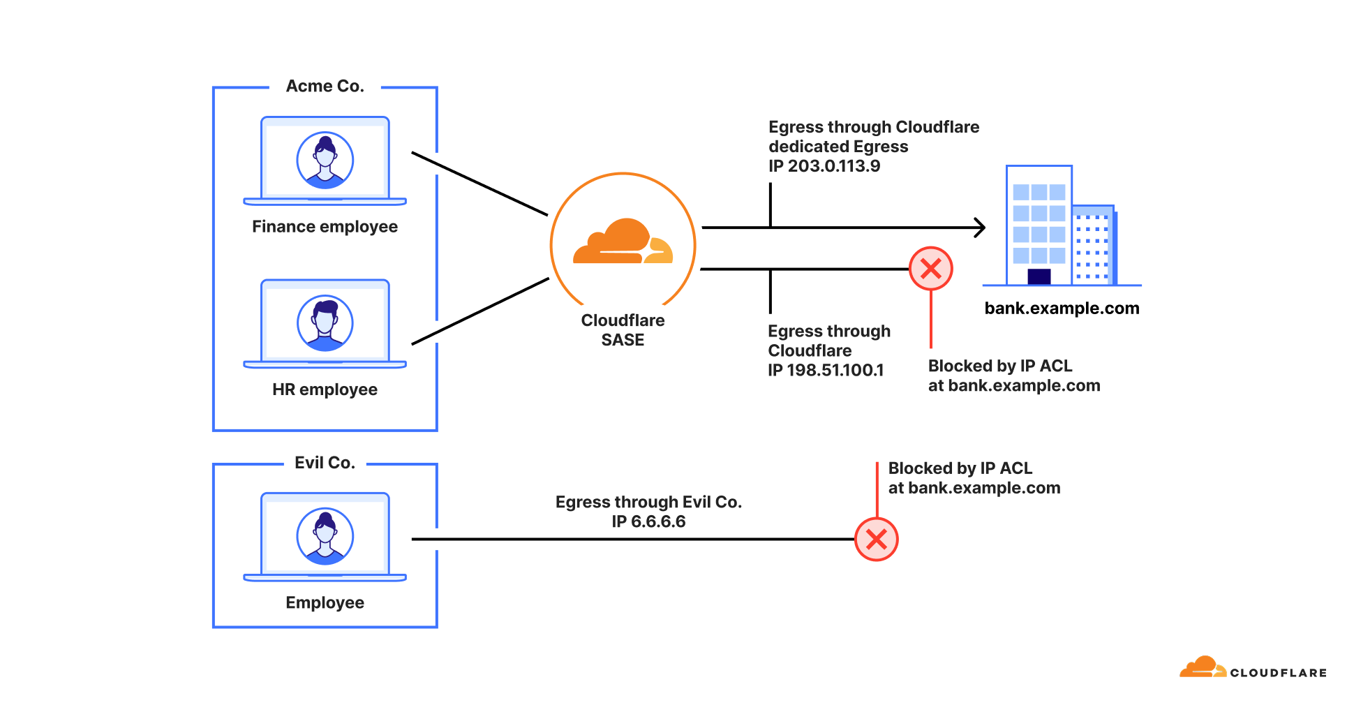 As shown in the figure above, the combination of the banking application's IP ACLs and Acme Co’s egress policies ensures that https://bank.example.com