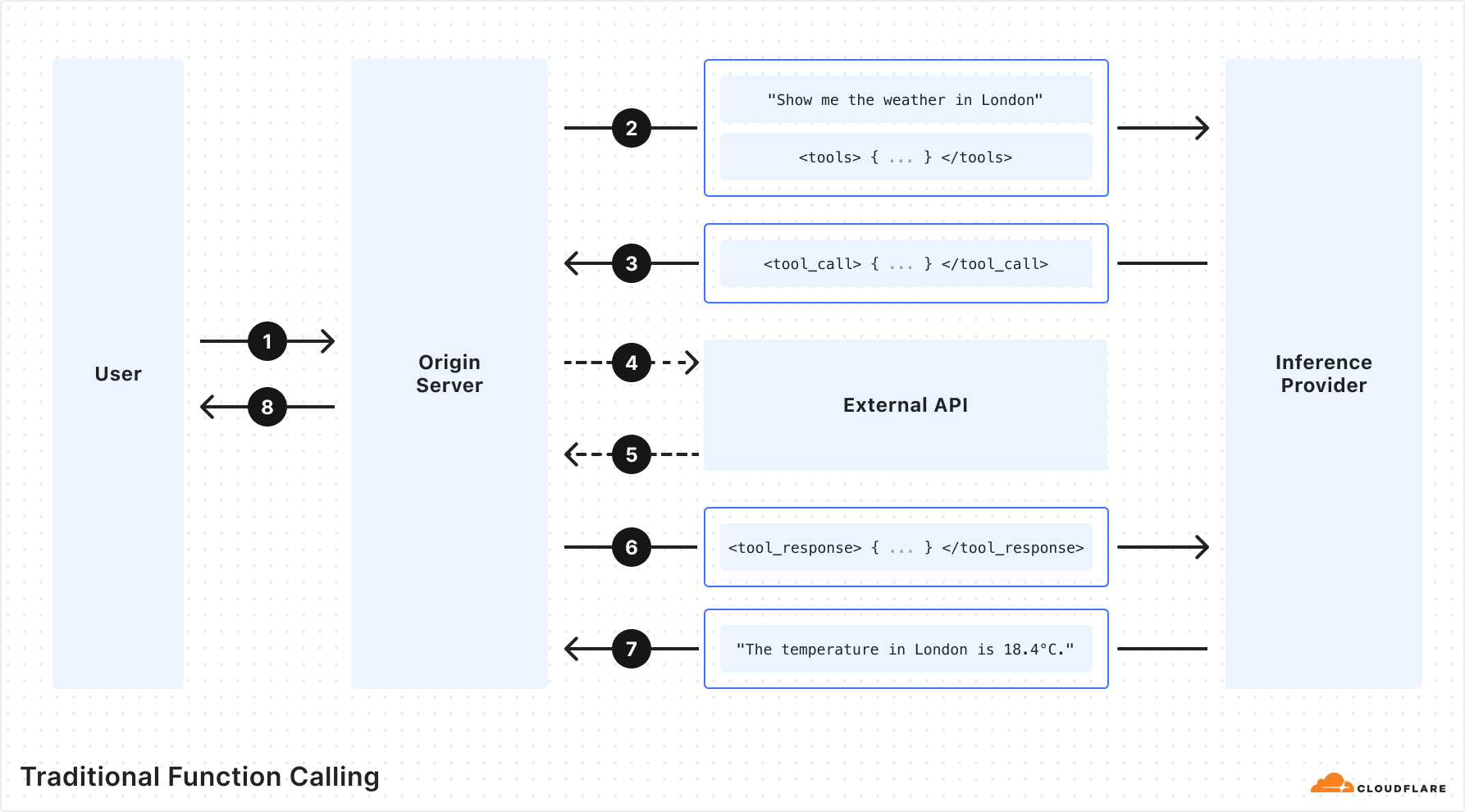 Traditional function calling requires multiple back-and-forth requests passing through the network in order to get to the final output. This includes requests to your origin server, an inference provider, and external APIs. As a developer, you have to orchestrate all the back-and-forths and handle all the requests and responses. If you were building complex agents with multi-tool calls or recursive tool calls, it gets infinitely harder. Fortunately, this doesn’t have to be the case, and we’ve solved it for you.