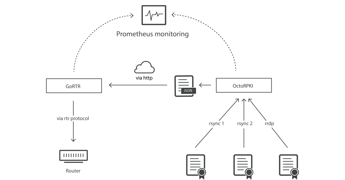OctoRPKI traverses a set of trusted certificate repositories, downloads all the records and manifests that they contain, and performs a set of validation checks on them. If they are valid, OctoRPKI will add their contents into a JSON file that is made available for GoRTR instances to consume.