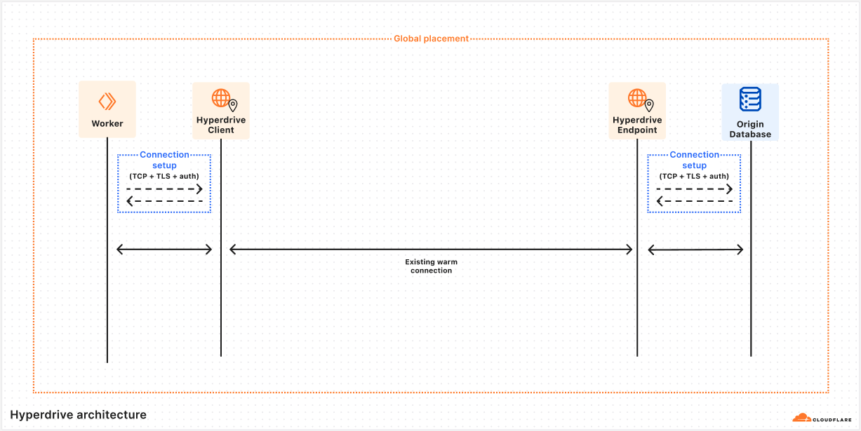 has not really changed since the original design of Hyperdrive. Sharing a server with the Worker sending the queries means that the Worker runtime can connect directly to Hyperdrive with no network hop needed. While there is always room for microoptimizations, it’s hard to do much better than that from an architecture perspective. By far the bigger piece of the latency puzzle is where to run Endpoint