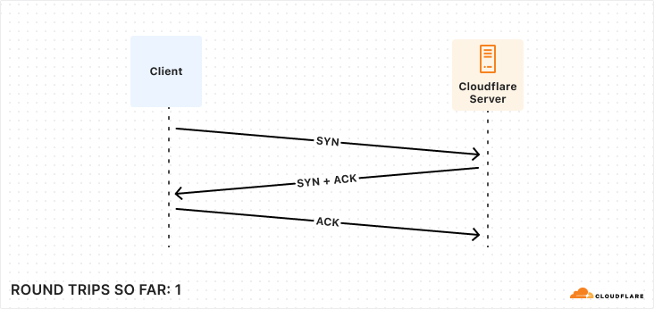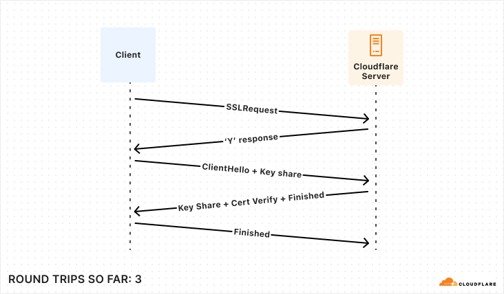 This “split connection” approach is the founding innovation of Hyperdrive, and one of the most vital aspects of it is how it affects starting up new connections. While the same 5+ round trips must always happen on startup, the actual time spent on the round trips can be dramatically reduced by conducting them over the smallest possible distances. This impact of distance can be so big that there is still a huge latency reduction even though the startup round trips must now happen twice (once each between the Worker and Client