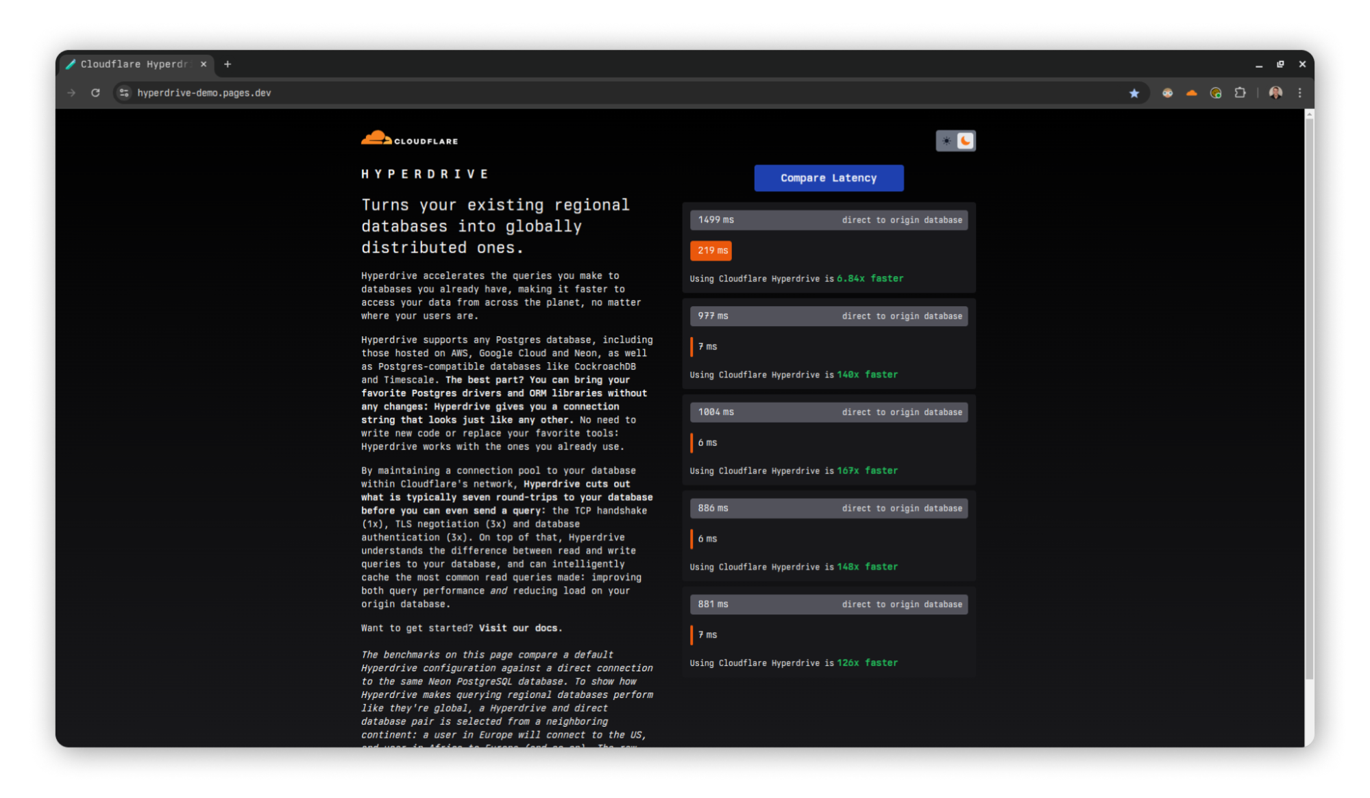 , this number is cut down to 500 ms (an almost 60% reduction). If you enable Hyperdrive’s caching, so that the SELECT query is served from cache, this takes only 320 ms. With this one-line change, Hyperdrive will reduce the latency of this Worker by almost 75%! In addition to this speedup, you also get secure auth and transport, as well as a connection pool to help protect your database from being overwhelmed when your usage scales up. See it for yourself using our demo application.