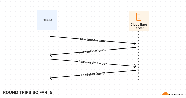 After the underlying transport is established and secured, the application-level traffic can actually start! However, we’re not quite ready for queries, the client still needs to authenticate to a specific user and database. Again, there are multiple supported approaches that offer varying levels of speed and security. To make this comparison as fair as possible, we’re again going to consider the version that offers the fastest startup (password-based authentication).
