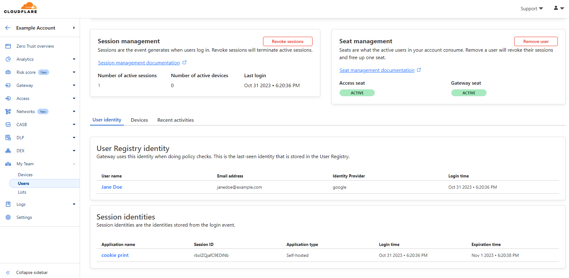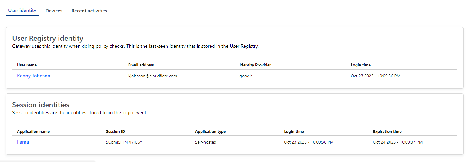 We set out to build a better way to debug issues related to a user’s identity in Cloudflare Zero Trust without sharing JWTs or HAR files back and forth. Administrators can now view a user’s Registry Identity (used for Gateway policies) and all active Access sessions.