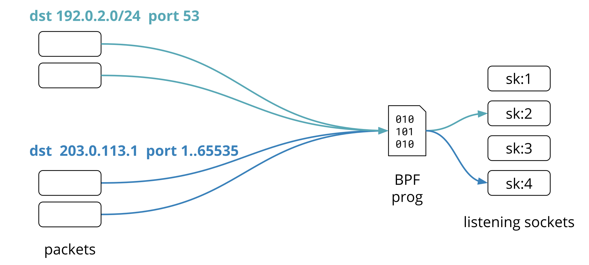 All packets coming on 192.0.2.0/24 prefix, port 53 are steered to socket sk:2, while traffic targeted at 203.0.113.1, on any port number lands in socket sk:4.