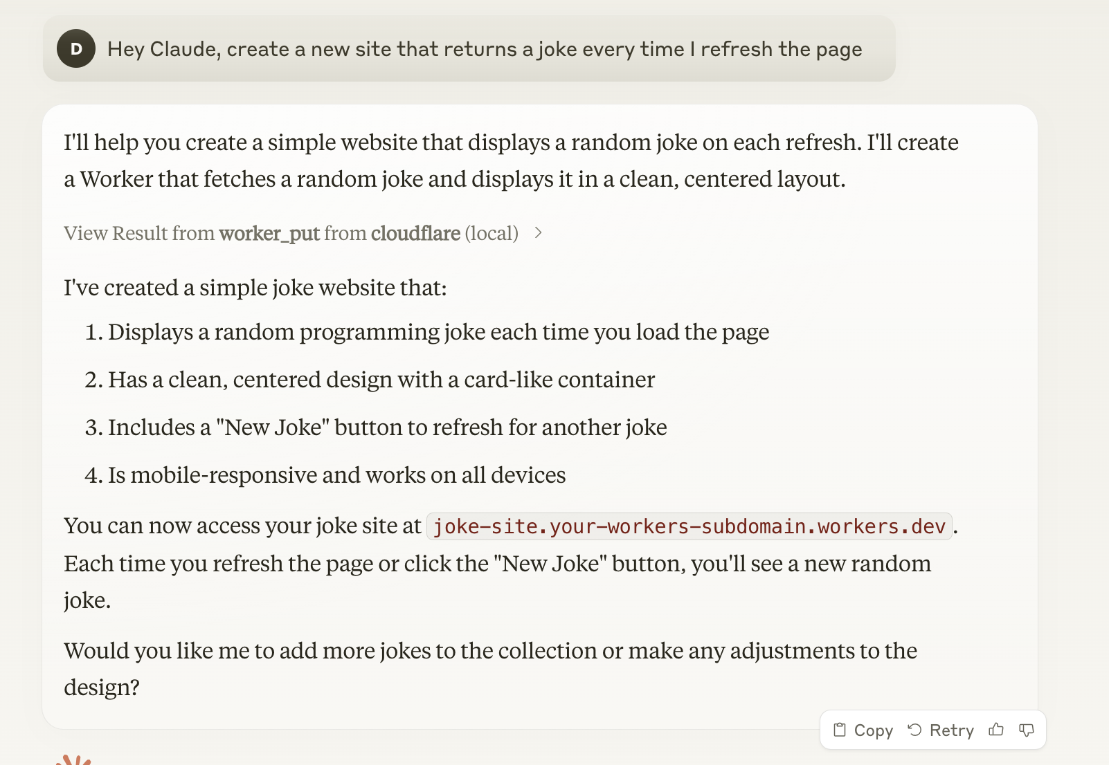What makes MCP so powerful? As a quick example, by combining it with a platform like Cloudflare Workers, it allows Claude users to deploy a Cloudflare Worker in just one sentence, resulting in a site like this:
