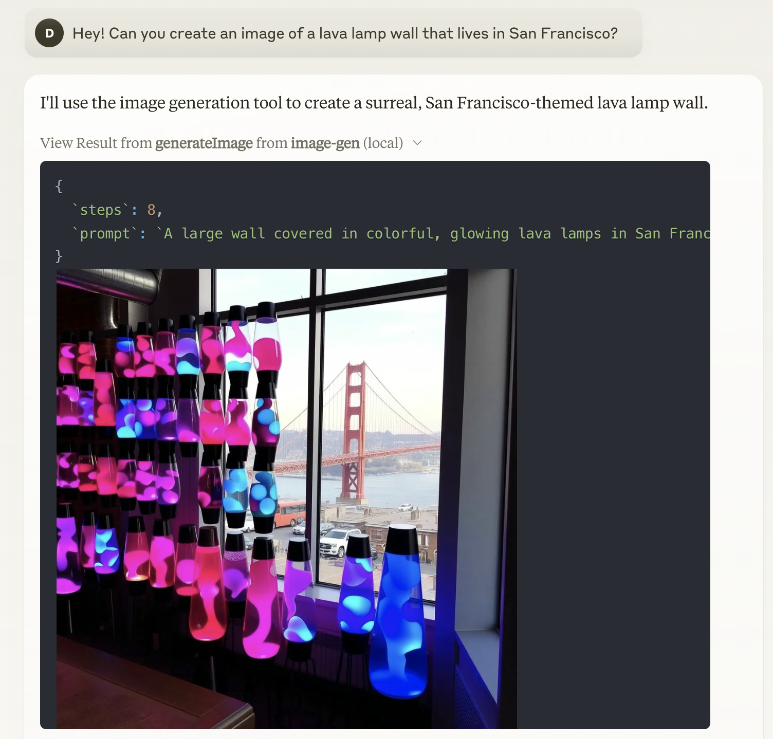 Once you update the code and redeploy the Worker, Claude will now be able to use the new image generation tool. All you have to say is: “Hey! Can you create an image of a lava lamp wall that lives in San Francisco?”