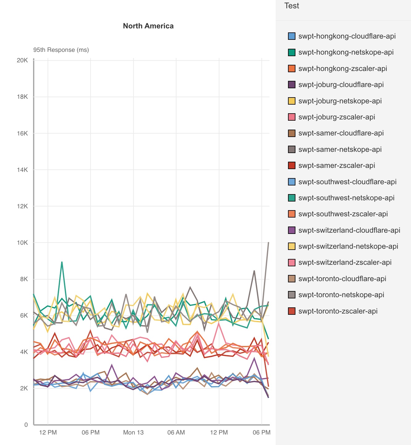 Cloudflare measured application access across ourselves, Zscaler and Netskope from 300 different locations around the world connecting to 6 distinct application servers in Hong Kong, Toronto, Johannesburg, São Paulo, Phoenix, and Switzerland. In each of these locations, Cloudflare’s P95 response time was faster than Zscaler and Netskope. Let’s take a look at the data when the application is hosted in Toronto, an area where Zscaler and Netskope should do well as it’s in a heavily interconnected region: North America.