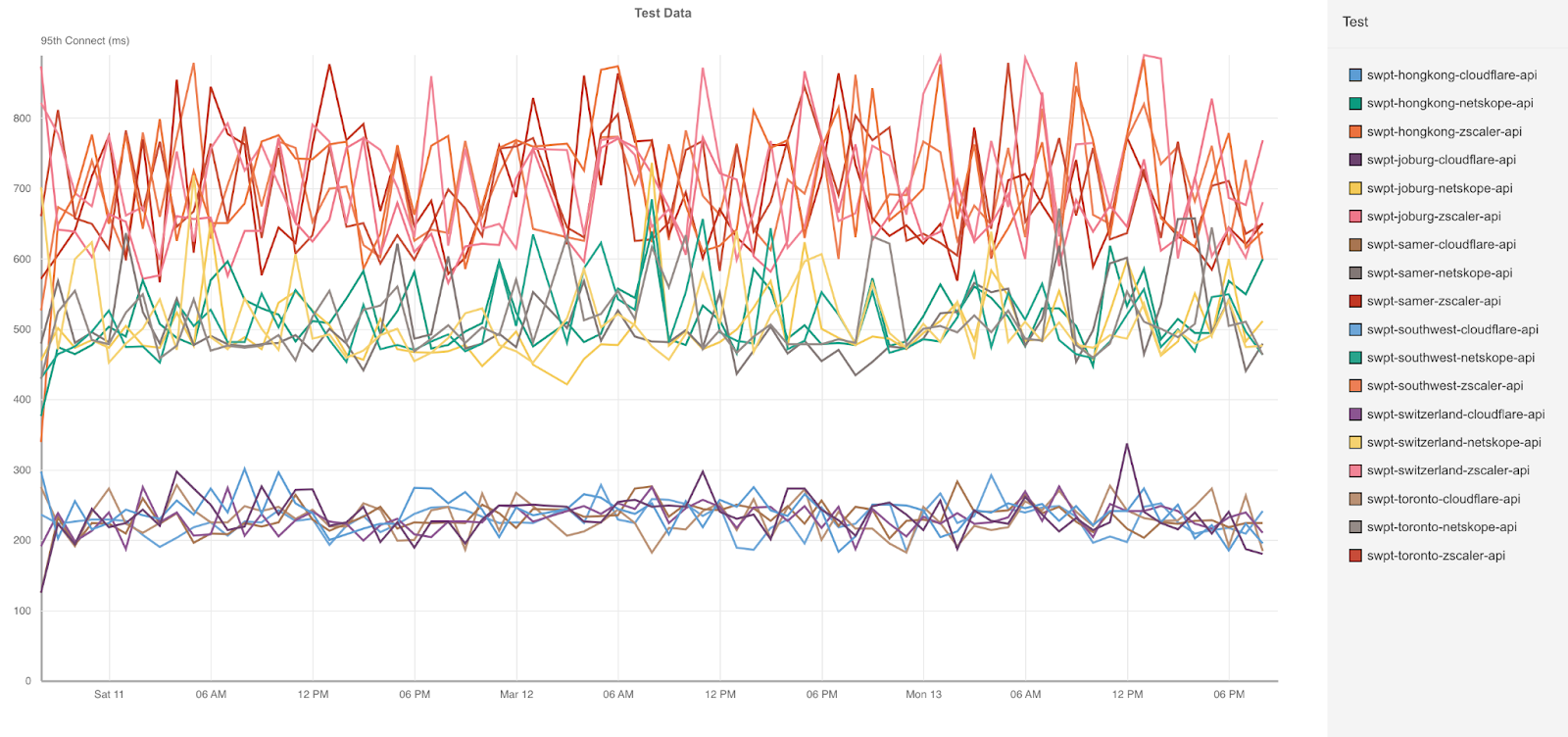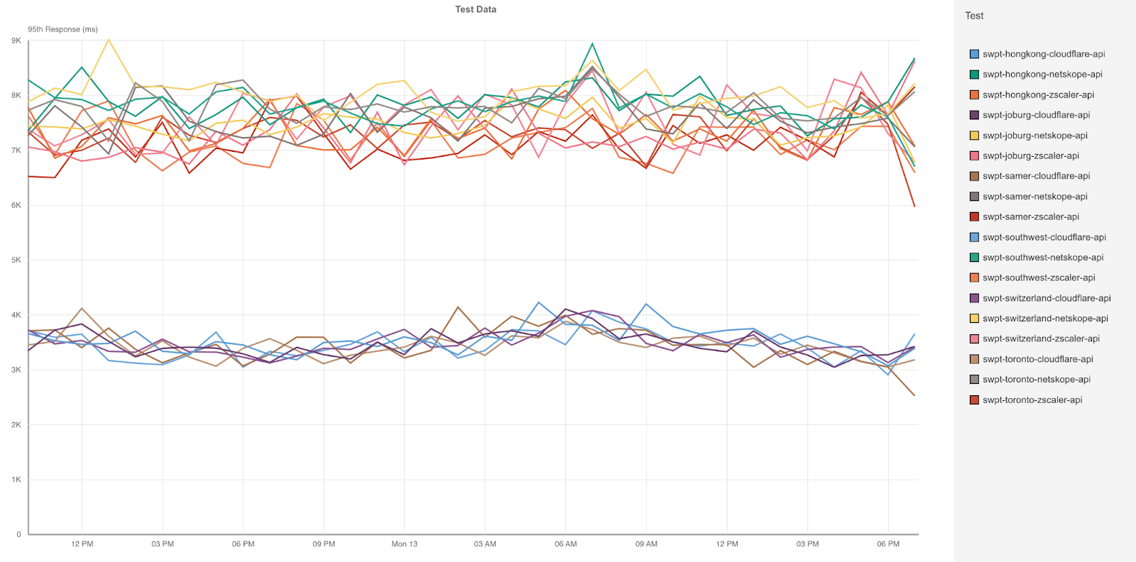 We like to separate these new and existing sessions because it’s important to look at similar request paths to do a proper comparison. For example, if we’re comparing a request via Zscaler on an existing session and a request via Cloudflare on a new session, we could see that Cloudflare was much slower than Zscaler because of the need to authenticate. So when we contracted a third party to design these tests, we made sure that they took that into account.