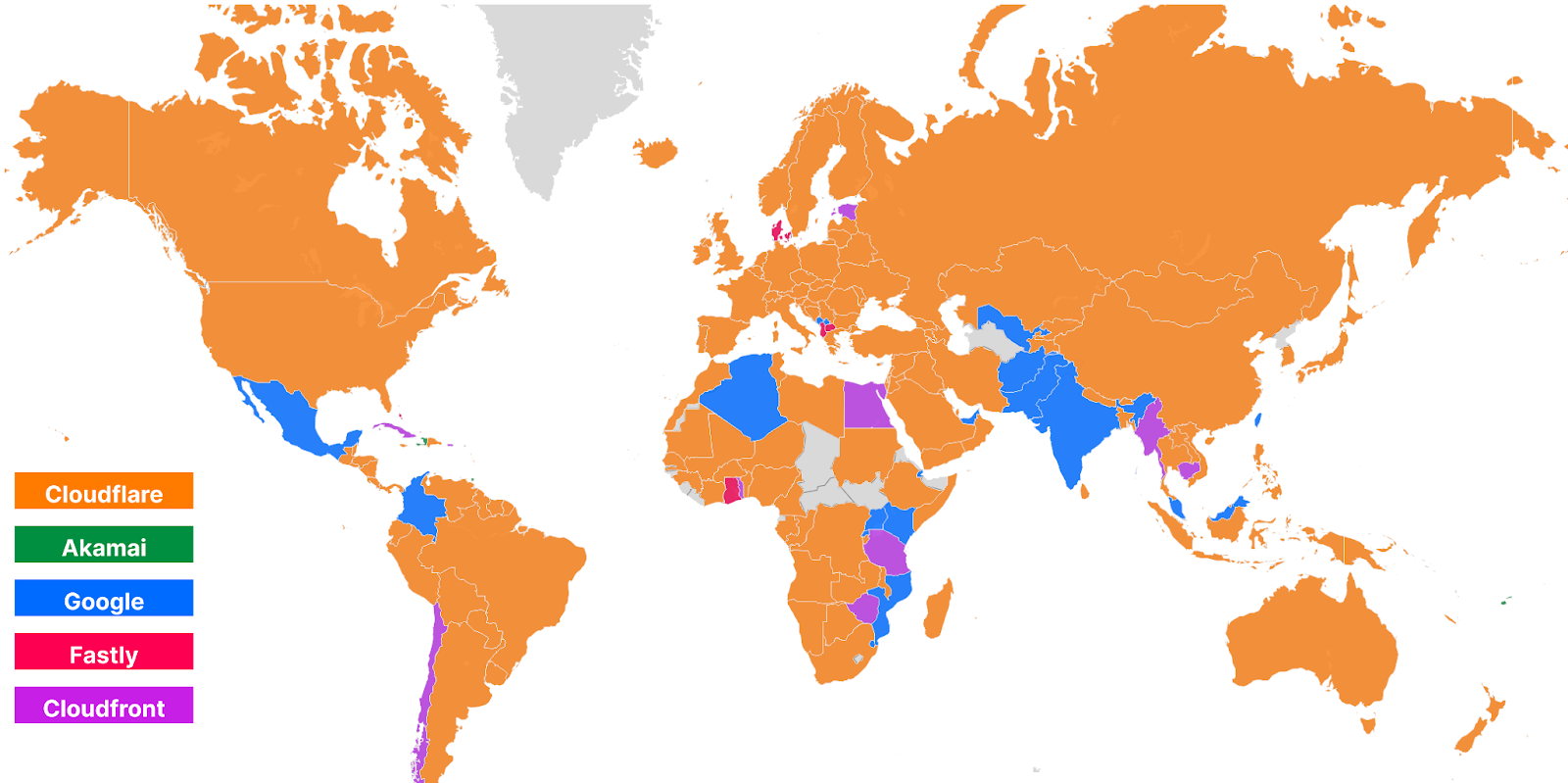 As you can see, Cloudflare has extended its lead in being faster in more networks, while other networks that previously were faster like Akamai and Fastly lost their lead. This translates to the effects we see on the World Map. Here’s what that world map looked like in Developer Week 2022: