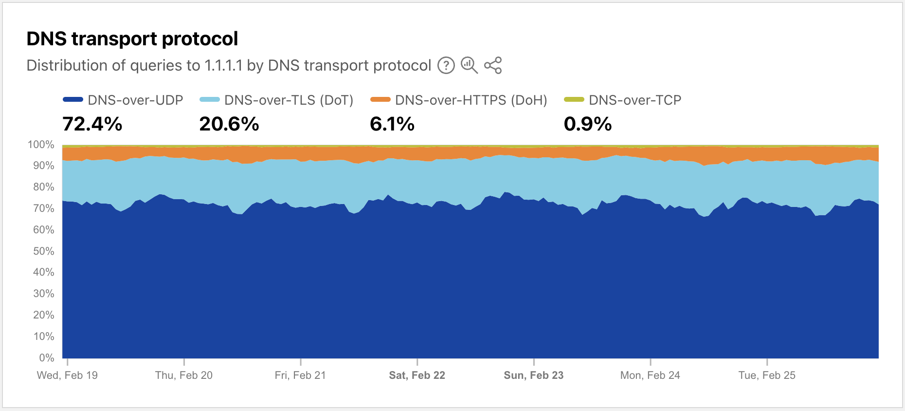 Published in November 1987, RFC 1035 notes that “The Internet supports name server access using TCP [RFC-793] on server port 53 (decimal) as well as datagram access using UDP [RFC-768] on UDP port 53 (decimal).” Over the subsequent three-plus decades, UDP has been the primary transport protocol for DNS queries, falling back to TCP for a limited number of use cases, such as when the response is too big to fit in a single UDP packet. However, as privacy has become a significantly greater concern, encrypted queries have been made possible through the specification of DNS over TLS (DoT) in 2016 and DNS over HTTPS (DoH) in 2018. Cloudflare’s 1.1.1.1 resolver has supported both of these privacy-preserving protocols since launch. The DNS transport protocol graph shows the distribution of queries to 1.1.1.1 over these four protocols. (Setting up 1.1.1.1 on your device or router uses DNS over UDP by default, although recent versions of Android support DoT and DoH. The 1.1.1.1 app uses DNS over HTTPS by default, and users can also configure their browsers to use DNS over HTTPS.)
