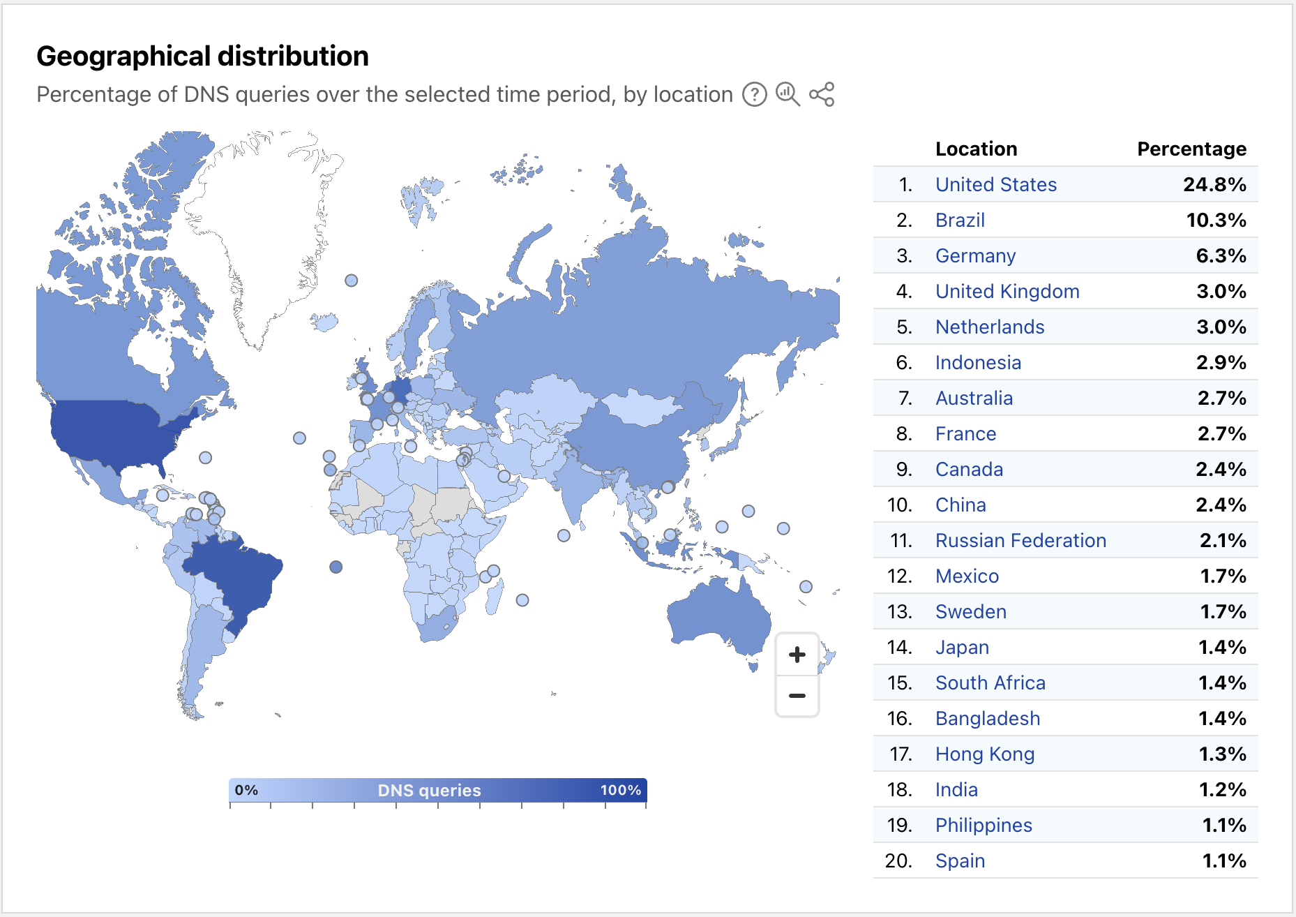Individual domain pages (like the one for cloudflare.com, for example) have long had a choropleth map and accompanying table showing the popularity of the domain by location, based on the share of DNS queries for that domain from each location. A similar view is included at the bottom of the worldwide overview page, based on the share of total global queries to 1.1.1.1 from each location.