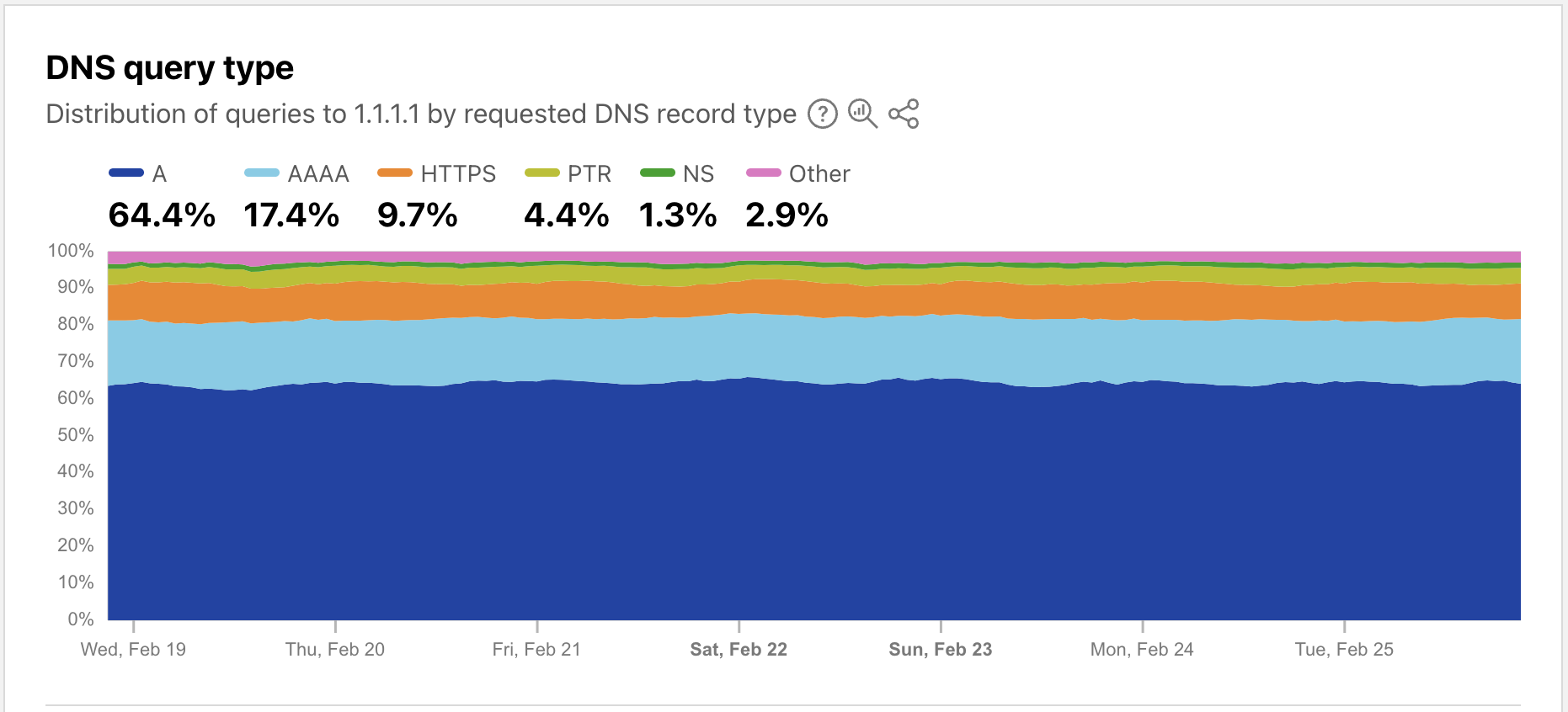 , which return the hostname’s IPv4 and IPv6 addresses respectively (assuming they exist). The DNS query type graph below shows that globally, these two record types comprise on the order of 80% of the queries received by 1.1.1.1. Among the others shown in the graph, HTTPS