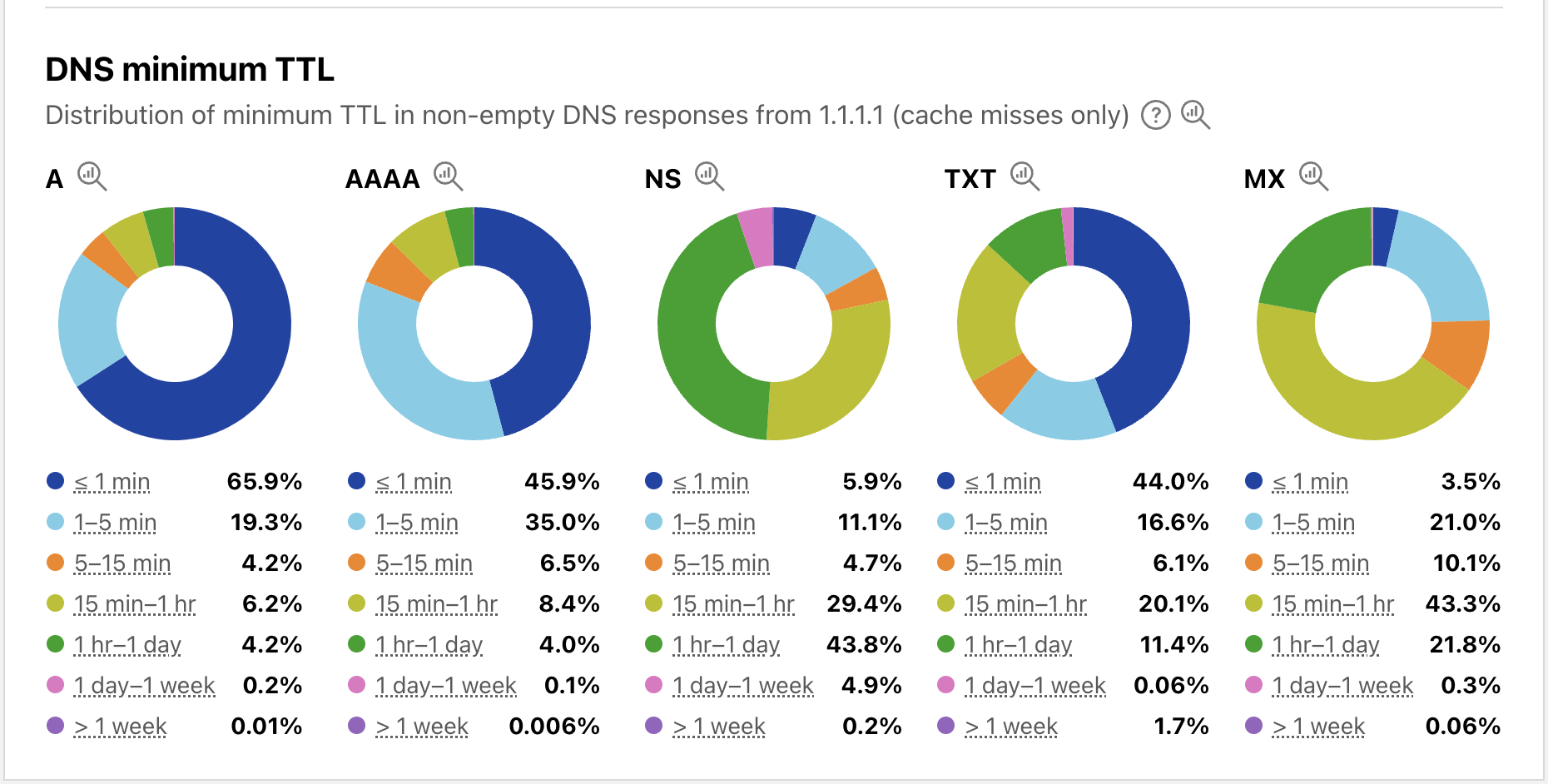 As noted in the preceding paragraph, when an authoritative nameserver sends a response back to 1.1.1.1, each record inside it includes information about how long it should be cached/considered valid for. This piece of information is known as the Time-To-Live (TTL) and, as a response may contain multiple records, the smallest of these TTLs (the “minimum” TTL) defines how long 1.1.1.1 can cache the entire response for. The TTLs on each response served from 1.1.1.1’s cache decrease towards zero as time passes, at which point 1.1.1.1 needs to go back to the authoritative nameserver. Hostnames with relatively low TTL values suggest that the records may be somewhat dynamic, possibly due to traffic management of the associated resources; longer TTL values suggest that the associated resources are more stable and expected to change infrequently.
