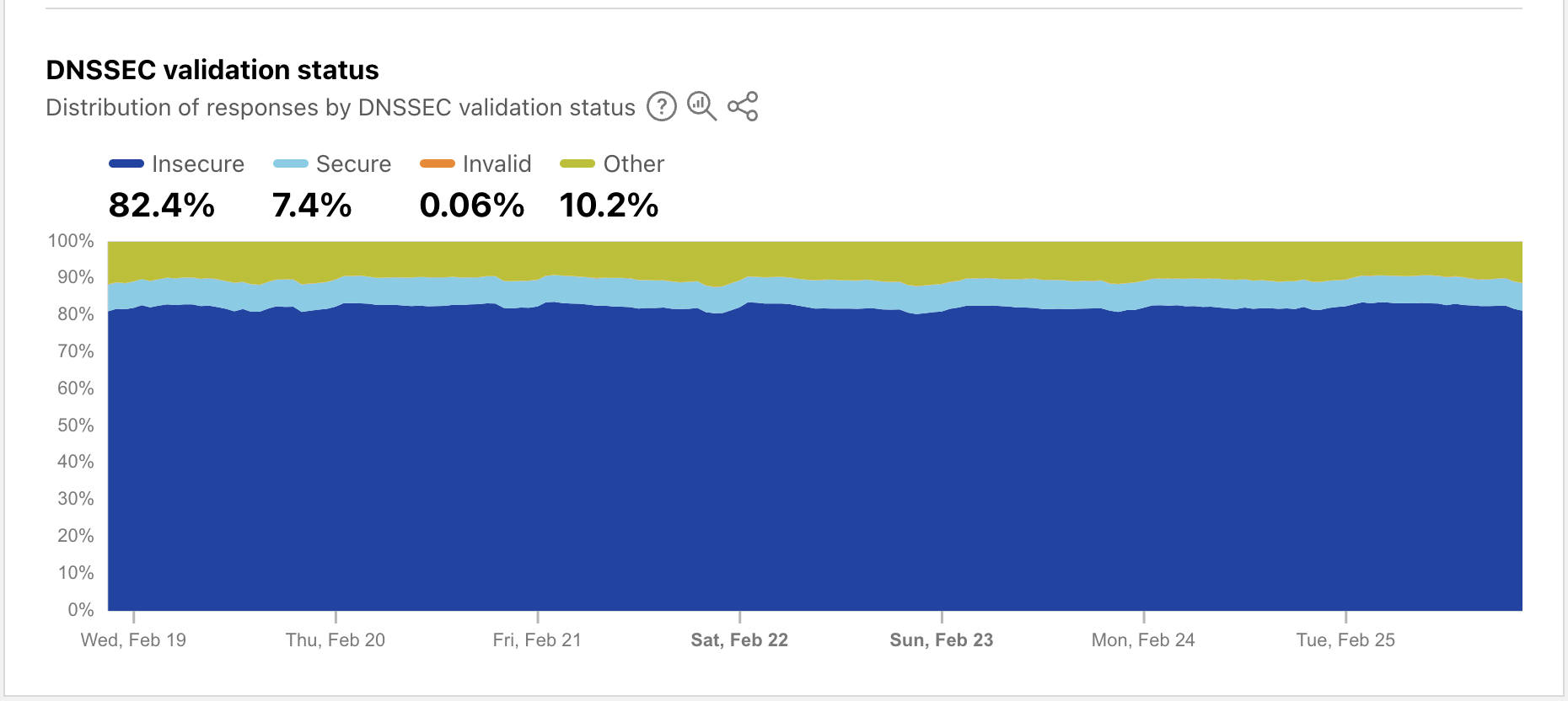 DNS Security Extensions (DNSSEC) add an extra layer of authentication to DNS establishing the integrity and authenticity of a DNS response. This ensures subsequent HTTPS requests are not routed to a spoofed domain. When sending a query to 1.1.1.1, a DNS client can indicate that it is DNSSEC-aware by setting a specific flag (the “DO” bit) in the query, which lets our resolver know that it is OK to return DNSSEC data in the response. The DNSSEC client awareness graph breaks down the share of queries that 1.1.1.1 sees from clients that understand DNSSEC and can require validation of responses vs. those that don’t. (Note that by default, 1.1.1.1 tries to protect clients by always validating DNSSEC responses from authoritative nameservers and not forwarding invalid responses to clients, unless the client has explicitly told it not to by setting the “CD” (checking-disabled) bit in the query.)