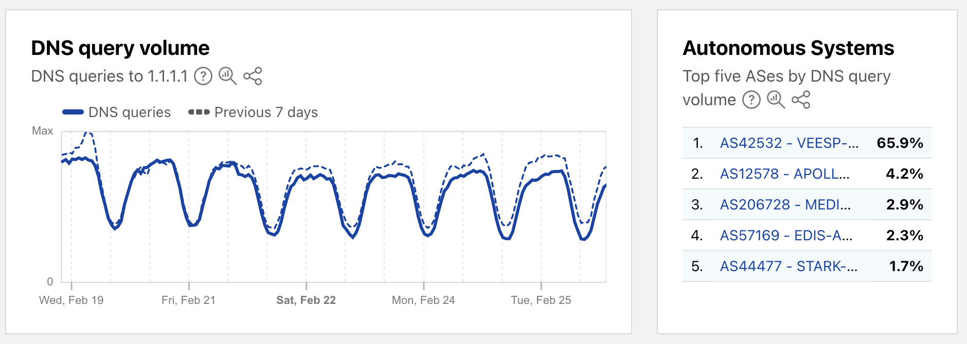 For location-level views (such as Latvia, in the example below), a table showing the top five ASNs by query volume is displayed alongside the graph. Showing the network’s share of queries from the selected location, the table provides insights into the providers whose users are generating the most traffic to 1.1.1.1.