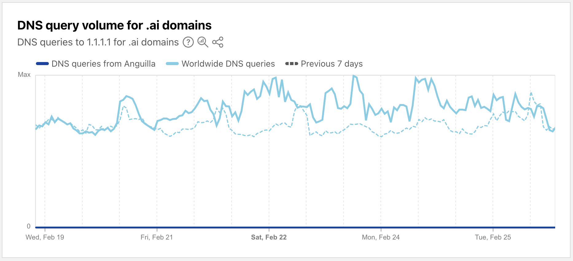 When a country/region is selected, in addition to showing an aggregate traffic graph for that location, we also show query volumes for the country code top level domain (ccTLD) associated with that country. The graph includes a line showing worldwide query volume for that ccTLD, as well as a line showing the query volume based on queries from the associated location. Anguilla’s ccTLD is .ai, and is a popular choice among the growing universe of AI-focused companies. While most locations see a gap between the worldwide and “local” query volume for their ccTLD, Anguilla’s is rather significant — as the graph below illustrates, this size of the gap is driven by both the popularity of the ccTLD and Anguilla’s comparatively small user base. (Traffic for .ai domains from Anguilla is shown by the dark blue line at the bottom of the graph.) Similarly, sizable gaps are seen with other “popular” ccTLDs as well, such as .io (British Indian Ocean Territory), .fm (Federated States of Micronesia), and .co (Colombia). A higher “local” ccTLD query volume in other locations results in smaller gaps when compared to the worldwide query volume.