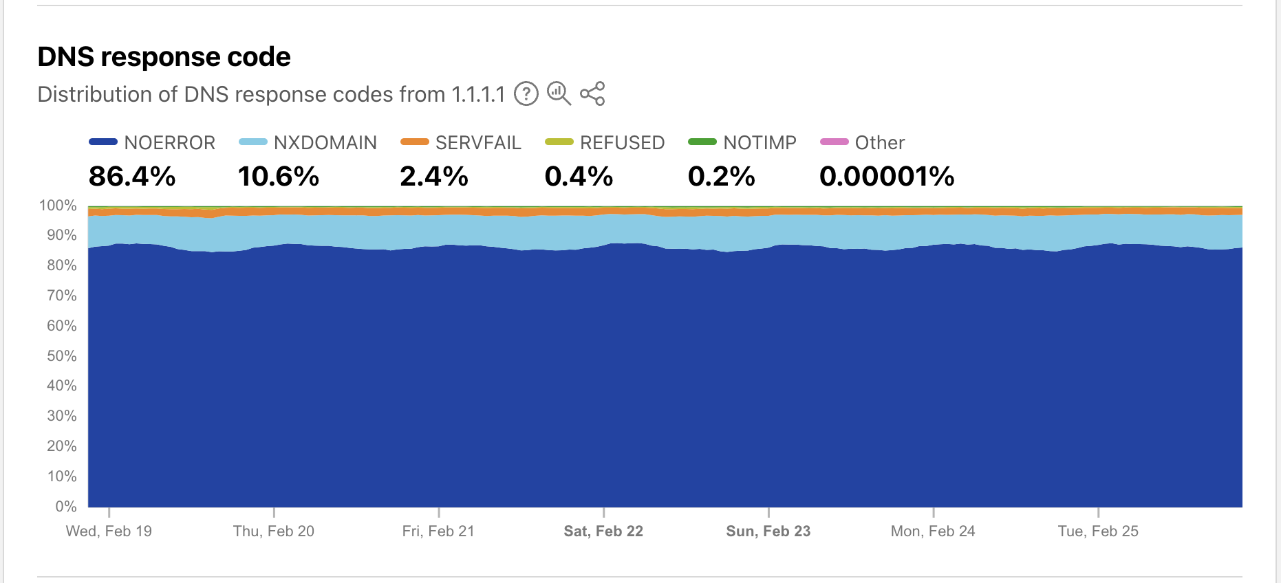 The DNS response code graph shown below highlights that the vast majority of queries seen globally do not encounter an error during the resolution process (NOERROR