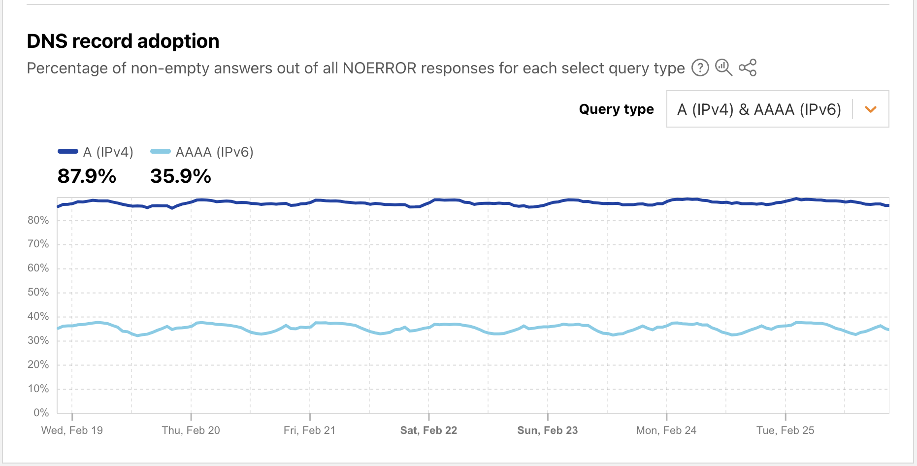 records (e.g. email domains that only have MX records). But the same graph also shows that there’s still a significant adoption gap where IPv6 is concerned.