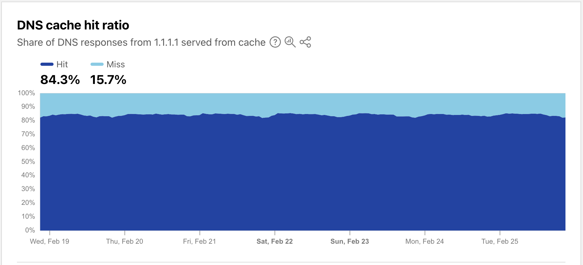 When Cloudflare’s DNS resolver gets a response back from an upstream authoritative nameserver, it caches it for a specified amount of time — more on that below. By caching these responses, it can more efficiently serve subsequent queries for the same name. The DNS cache hit ratio graph provides insight into how frequently responses are served from cache. At a global level, as seen below, over 80% of queries have a response that is already cached. These ratios will vary by location or ASN, as the query patterns differ across geographies and networks.